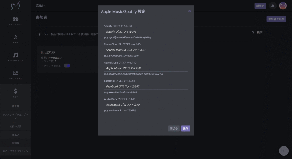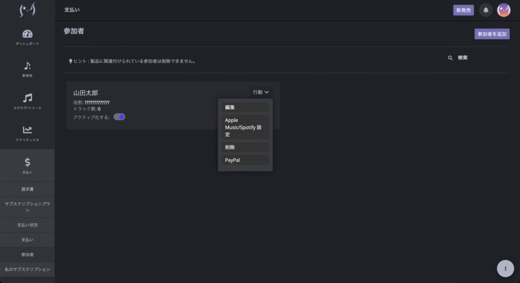 アーティストプロフィールは、参加者(クレジット)情報と紐づけていただくことになります。「メニュー」→「支払い」→「参加者」より、参加者一覧ページをご確認ください。